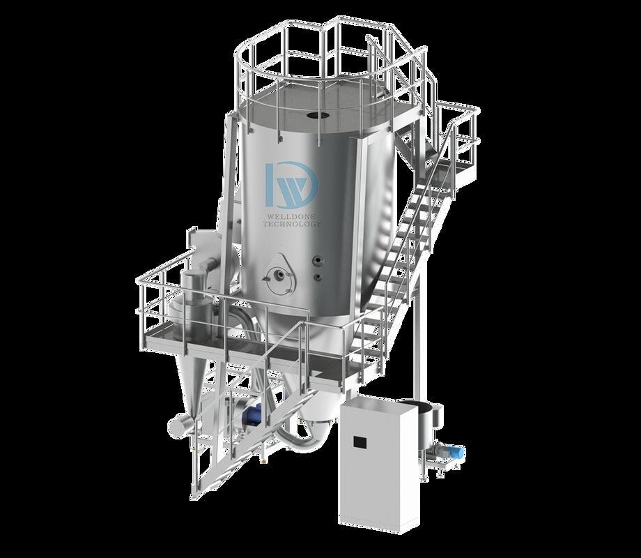Hot air enters into dryer in spiral form under the function of air distributor after being filtered and heated. By passing through high-speed rotary atomizer on top of tower, the liquid raw material will be sprayed into the extremely fine mist beads. Through the very short time of contacting with hot air, the liquid can be dried into final solid powder products. The final products will be discharged continuously from the bottom of drying tower and from cyclone separator. Waste tail air will be discharged from exhaust fan.